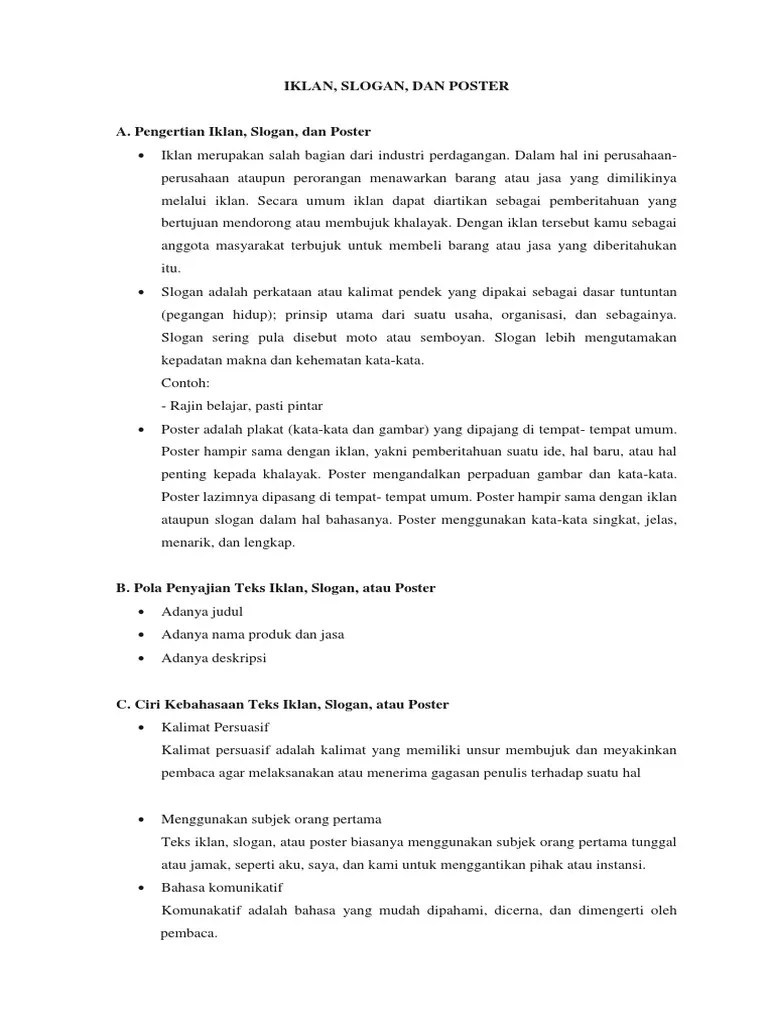 Fungsi iklan, slogan dan poster adalah membujuk khalayak berbuat sesuatu. Contoh iklan cetak sering kita lihat di koran, majalah, koran kuning, poster, poster, dll. Terdapat berbagai contoh surat lamaran kerja berdasarkan iklan paling lengkap, yang bisa diikuti langkah. Pengertian iklan adalah berita pesanan untuk mendorong, membujuk khalayak ramai agar tertarik pada barang atau jasa yang ditawarkan atau pemberitahuan kepada khalayak ramai mengenai barang atau jasa yang dijual, dipasang di dalam media massa (seperti surat kabar dan majalah) atau di tempat umum. Jenis media yang di gunakan antara lain media cetak dan media elektronik. Poster harus dapat menarik perhatian, simpati dan minat para pembacanya. Iklan cetak merupakan sebuah iklan yang dipublikasikan dengan melalui media cetak seperti koran, majalah, surat kabar, tabloid dan yang lain sebagainya. Iklan dikomunikasikan melalui berbagai media massa, termasuk media tradisonal seperti majalah, televisi, radio, banner, blog, dll. Sebelum kita membahas perbedaan iklan, poster dan slogan, maka kita harus tahu dulu pengertiannya. Namun seiring berjalannya waktu orang mulai berpindah menggunakan media yang lebih praktis dan instan. Slogan ini sering didengarkan di radio, tv, atau media massa lainnya. Menurut suyanto dalam strategi perancangan iklan televisi perusahaan top dunia (2005), slogan atau themeline atau tagline yang tertuang dalam pesan iklan televisi merupakan awal kesuksesan periklanan. Berdasarkan ruang yang dipakai iklan jenis ini dapat di bedakan menjadi 2 bentuk, yaitu iklan baris dan iklan kolom.